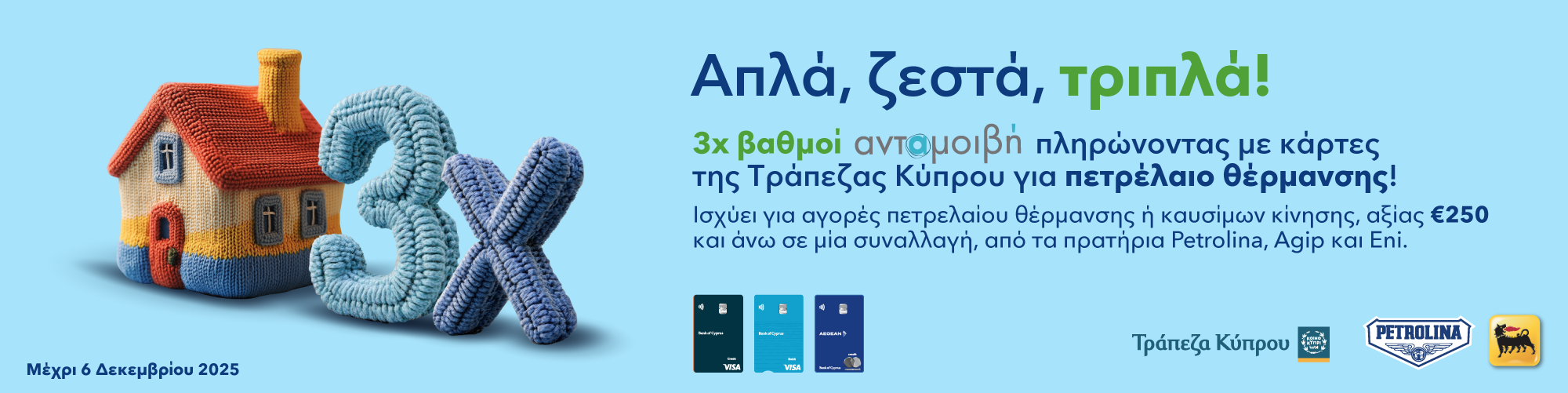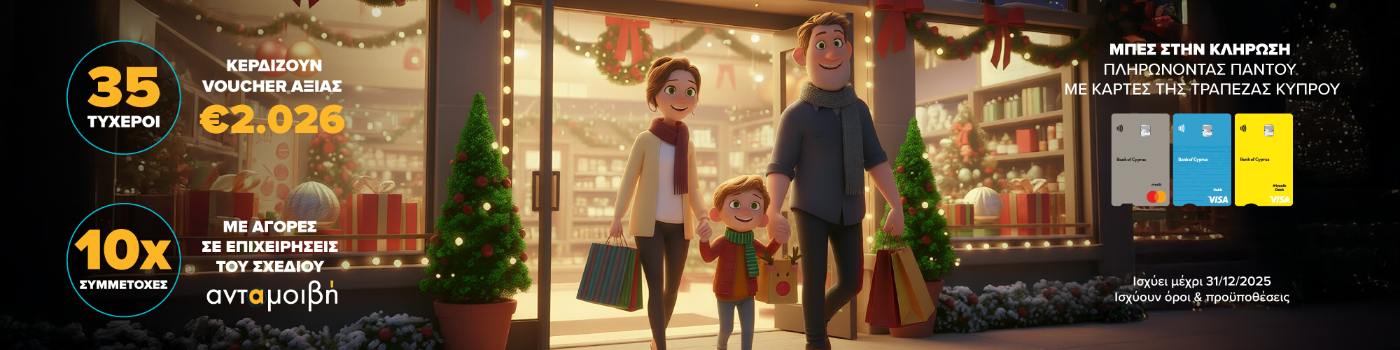 Οι κάρτες της Τράπεζας Κύπρου ανταμείβουν την κάθε σας συναλλαγή που γίνεται με κάρτα μέσα από το πρωτοποριακό πρόγραμμα επιβράβευσης καρτών ανταμοιβή. Χρησιμοποιώντας τις κάρτες σας για τις καθημερινές σας αγορές στις συνεργαζόμενες επιχειρήσεις στην Κύπρο κερδίζετε βαθμούς τους οποίους μπορείτε να εξαργυρώσετε άμεσα.